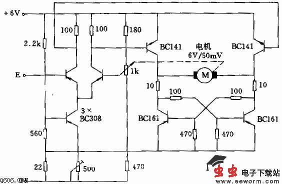 该电路中E、O两点输入直流电压,电机就将运动到与给定电压相对应的位置上。与电动机同轴相连的电位器用作位置反馈。当给定电压与1k电位器滑动触点电压相等式,差分放大器输出为零,故电动机静止不动;否则电动机将根据信号大小而正转或反转。
