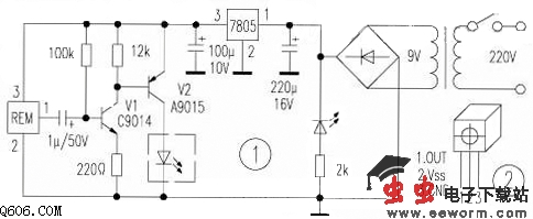 红外接收头REM可选用通用一体化红外接收头,形状如图,REM收到的红外遥控信号经V1、V2放大后推动红外发射管工作。图中虚线以外部分放在客厅,红外发射二极管用同轴电缆与接收部分相连后,置于卧室卫星接收机前适当的隐蔽处。有了这套装置,便可以拿着遥控器方便地在客厅里选看需要收视的电视节目了。