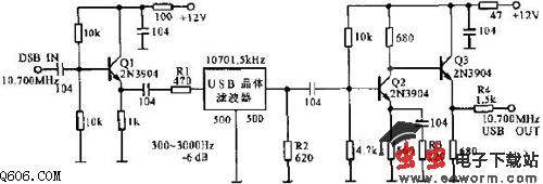 该图为输入10.700MHz DSB信号而输出为10.700MHz USB信号产生电路图。Q1为射随器;Q2为输入阻抗较大的共射极放大器;Q3为射随器作缓冲输出级。USB晶体滤波器只允许10.700MHz的DSB信号的上边带通过。