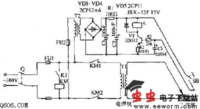 图中SB是加装在电焊机胶柄上的微型开关。使用时,闭合Q,按下按钮开关SB,VT导通,继电器K吸合,触点K1闭合,交流接触器KM得电,触点KM1、KM2闭合,电焊机开始工作。焊接完后,SB断开,经一定时间后,继电器K释放,K1开路,交流接触器KM失电。图中C3用于使K延时释放,可避免在焊接时,SB频繁通断造成电焊机工作电源的不正常。