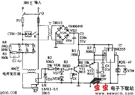 电焊机空载时,电流互感器LH中无感应电流:VT1、VT2均截止,使NE555的脚3为低电位,继电器K释放,交流接触器KM失电,电容器C1串入电路,使电焊机进入空载节电状态。C1为电焊机下次焊接时提供一很小的起动电流。当焊接时,焊条与工件接触瞬间LH产生的感应电压使VT1、VT2导通,IC的脚3变为高电位,使K、KM吸合,焊机进入正常焊接。改变C3的容量,可在10~20s范围内延时交流接触器的频繁动作时间。