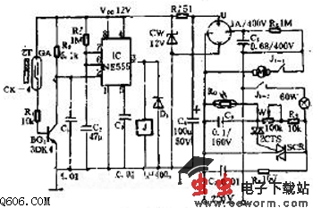由磁控开关CK-4和BG1、R1、R2组成电子开关。当厕所门关上后,永久磁铁ZT与干簧管GA贴近,GA内两触片分离,BG1截止,IC的2脚高电平而复位,3脚输出低电平,继电器J无电而释放。换气扇和照明灯无电。当有人上厕所时,门打开,使ZT与GA分开,干簧管GA两触片闭合,BG1导通,IC的2脚低电平而置位,3脚高电平,J吸合,使换气扇得电运转。电灯电路J1-2也接通了电源。但是如果是白天,因Ro受光照呈低阻态,C6上的电压不足以击穿2CTS,故SCR截止,电灯不亮。夜间,Ro无光照而电阻很大,于是,C6上电压高使2CTS导通,SCR被触发导通,电灯点亮。