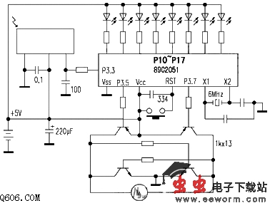 家里的玩具车进行改装,使之能用彩电遥控器控制其进退速度,电路如图。P10~P17口接发光管,作8挡速度显示;P3.5、P3.7控制电机进退,二者不能同时为低电平,其输出周期为80ms的调宽方波。三极管的功率视电机电流而定。遥控器的节目“+”、“-”键控制进退,音量键用于加减速度,电源键作停车控制。遥控距离10米,要求不被家具遮挡。
