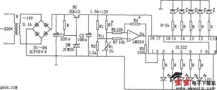 如图所示为电冰箱温摩告知电路。该电路由降压整流电路、温度检测元件Rt、集成运算放大器LM324、电平显示集成电路SL322等组成。其中降压整流电路为整个电路提供直流电压,Rt为热敏电阻,SL322用于驱动发光二极管发光。