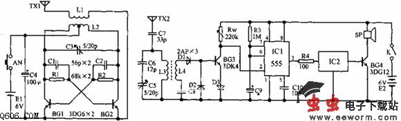 发射电路:由分立元件组成自激多谐振荡器,其振荡频率主要由L2、C3决定。图中元件可得30~40MHz的发射频率。平时电路处于断开状态,按下AN后电源接通,电路发出振荡信号。