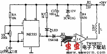在冰箱中,鱼、肉等食品需解冻后才能烹调食用。将冻物放入水中,再将音频振动引入,可以加速解冻的过程,比常用的温水解冻缩短了一半时间,并且不损坏食物的新鲜度。音频解冻的原理在于使水和冰冻物互相冲撞,冰的结合物就会松散,水分子渗入冰中后,加速了冰的融化。用一铁制容器,容积约0.1m 3平方,在其底部放一开口的电磁铁L,变化的磁力线使筒底振动并传入水中即可达到目的。电路中555产生方波振荡,VR调节振荡频率,LED用于工作指示,振荡信号送到大功率直流开关TWH8752的1脚,电磁铁接在4脚。直流工作电源经变压器降压整流滤波后得到,电源功率容量约100W,正常时工作电流为4A.
