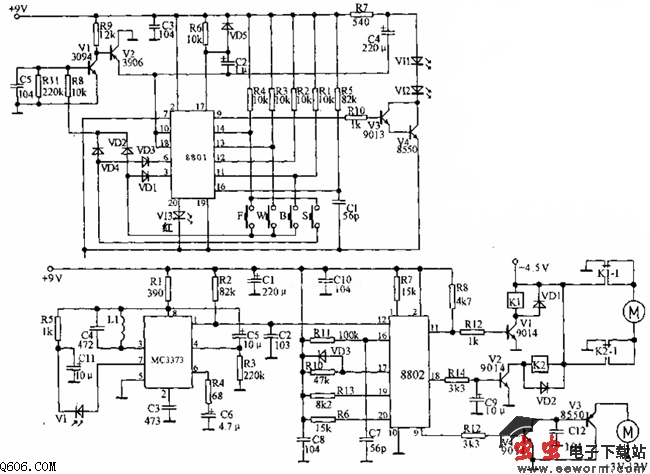 接收电路:红外信号由光电管从7脚输入MC3373,放大后的信号从1脚输出,送入译码器8802的12脚。当发射器“F”按下时,8802的11脚电压升为2.5V,V1导通,K1吸合,M正转。当接收到“B”信号时,11脚电压降低,18脚电压升为5V,K1释放,K2吸合,电机反转。按下“W”键时,9脚电压升高,V4、V5导通,可驱动100mA以下的直流电机,再按一下“W”,9脚复位。当接收机收到发射器的“S”信号时,8802复位,11、8、9脚都为0V.