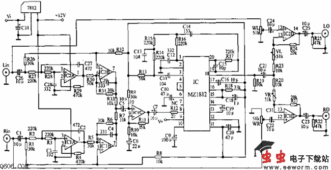 该电路可将双声道或单声道信号转化为两路前置主功放信号和两路后置环绕声信号。还设有音乐厅、电影院和模拟立体声三种声场模式,以及环绕声音效果、平衡、高低音及音量控制。各控制均采用直流电平,使电路杂音减小。声场模式由IC的7、8脚电平进行控制。7、8脚均接地时模拟声场关;7、8脚都接5V时为音乐厅效果;7脚接地、8脚接5V为影院效果;7脚接5V、8脚接地时为模拟立体声效果。电路中RP1为环绕声效果控制;RP2为输出平衡控制;RP3为前置主功放音量控制;RP4为后置环绕声音量控制;RP5、RP6为高低音控制。