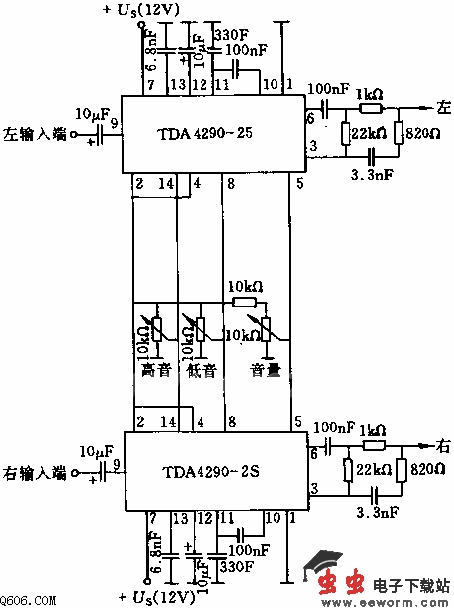 该电路高低音提升或降低的程度以及音量调节与之前电路类似。音量调节部分将脚4与脚2参考电位点相连,故此时脚3和脚6处音调降低的程度不同。若在脚3和脚6间接入一个同频率有关的网络,则可在其抽头处得到随音量电平不同而不同的输出信号,此信号可分别控制左右两个声道的音响设备。