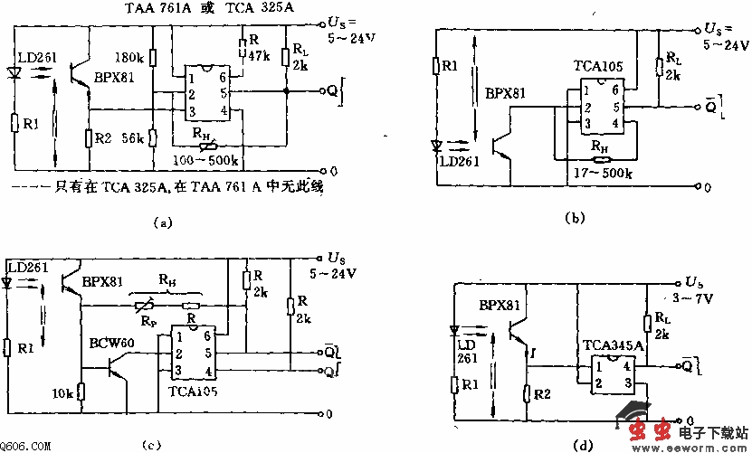四种电路均采用发光二极管LD261作为光发射器,其最佳工作电流约10mA,由电阻R1调整,对于不同供电电压时的R1值如表所示: