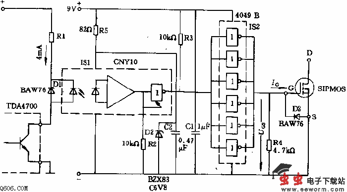 输入端经过电阻R2接地,以使其输出端在电源电压降至4V时还是开路的,即两个推挽输出晶体管保持在截止状态。这样可使电源电压在上升至3V左右时光耦输出侧仍为低电平,以使后接的六反相器4049能控制SIPMOS晶体管。在工作阶段,光耦输出端开路,使六反相器输出端为高电平,而输出端为低电平。