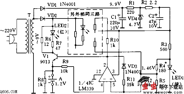 市电经变压器T次级降压后,一路由VD1整流,R1、C1滤波,VD4稳压后,经R2、C2二次滤波输出4.6V稳定电压,供四路控制电路用;另一路由VD2整流后提供四路半波脉冲电流供充电用。图中只画出其中一路控制电路,其余三路均相同。控制集成块用四比较器LM339,其同相输入端为1.46V的稳定电压,它是由R3、电源指示发光二极管LED1上得到的1.9V稳定电压经R4、R5分压通过R12提供的;比较器的反相输入端反映的是被充电电池的变化电压,由于比较器输入端不消耗电流,因此R9、R12上无压降,比较器能够真实地反映被比较电压的大小。当被充电电池电压较低时,同相输入端电位高,控制V1管导通,形成充电回路。同时充电指示发光二极管LED2点亮;当被充电电池电压达到1.46V时,比较器输出低电位,V1截止,充电回路切断,此时电池电压开始回落,由于有VD3、R11支路的影响,比较器有一定的回差,这样可以避免比较器出现振荡状态。只有电池电压回落较大时,比较器才又输出高电位使V1导通,恢复充电。这样电池处于间歇充电状态,LED2出现闪烁,随着被充电电池电量的增加,间歇时间越来越长,LED2闪烁的频率越来越低,最后保持在长时间熄灭状态时表示电量已充足。