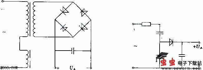 该电路稳压管前接电容、电阻元件。稳压管在其导通方向上通过输入电容接交流电源,而在阻断方向上限制电流,使后接的电容重新充电,从而使输出电压稳定。该电路电压脉动较桥式大,但由于直接接交流电源,故消耗电流较小。