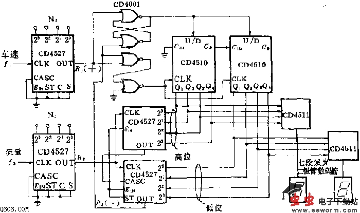 整个电路由CMOS集成电路构成。CD4527为频率乘法器,产生输出脉冲串,输出频率正比于两个输入的乘积。输出频率对时间进行平均。速度传感器与速度计电缆串联,它把速度数据馈送到频率乘法器的时钟输入端。油气流量传感器与油耗线路串联,把油耗数据馈送到另一个频率乘法器的CLK端。发光二极管2位数码能不断显示油耗效率,所显示的数字即表示油耗与里程的关系。