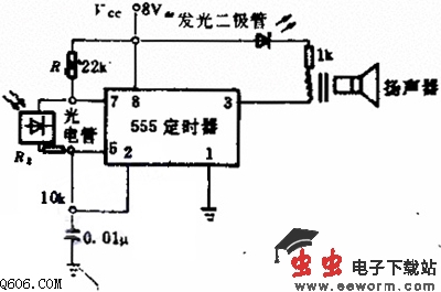 本电路用于探测闪电,可供盲人用作光雷达和报晓器等。555定时器的振荡频率随光强的增加而成比例增加。当它工作在自由振荡器方式时,其频率和占空比取决于2个电阻和一个电容器。R1把上限频率确定在6.5kHz左右,光电管的暗电阻R2使频率下限而定在约1Hz。扬声器产生声音输出,发光二极管则在频率低于12Hz时闪光,提供可视信号。