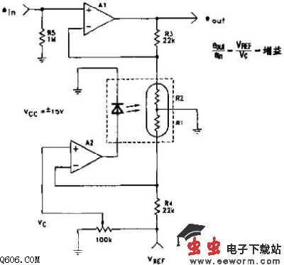 图为用于放大器的电控可编程增益控制电路。AOI具有一个中心抽头接地的LDR,一边接信号通道,一边接控制环路。信号放大器由运放A1、电阻R3、增益调节电阻R2和输入电阻R5组成。放大器的增益为G=Eout/Ein=(R2+R3)R2