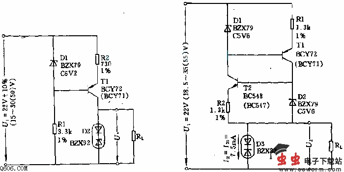该电路由稳压管D1、晶体管T以及电阻R1、R2构成恒流源,可供给由基准二极管D2和负载电阻Rl(这里为68k欧)构成的并联电路电流约7.6mA。由于D1上电流远大于晶体管的基-射极电流而D1中的电流又设计得很大(5mA),因此,由于晶体管数据分散性和输入电流波动引起的射极电流和基准二极管电流的变化也就很小。