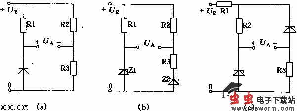 图c电路只适于输入电压和输出电压之间差值很小的情况。两个稳压管的工作电压应尽可能相等,两个电阻R2、R3也应相等。