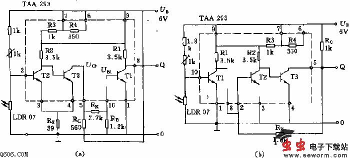 该电路采用TAA293作为阈值开关。1k欧电阻主要用于调整光敏电阻值和阈值开关的阈值。