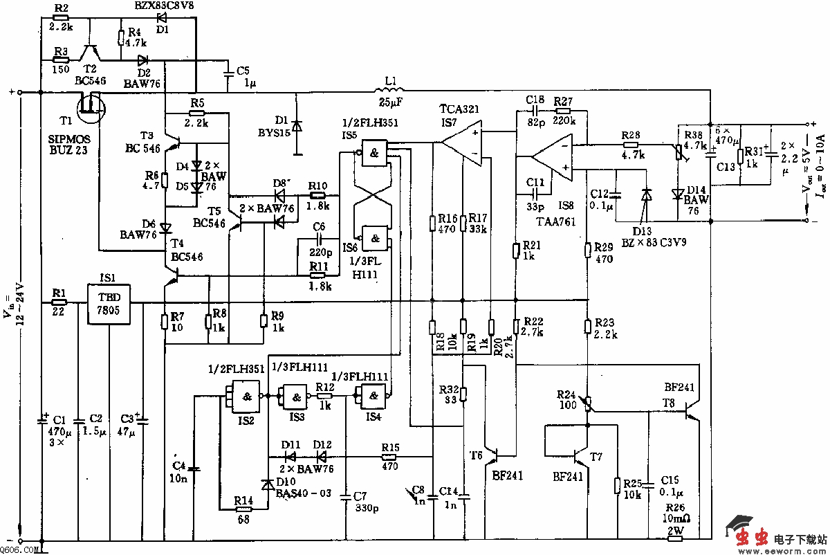 该电路可将24V直流电压变换为电压较低的输出直流电压。其开关晶体管采用SIPMOS管BUZ23,其特点是极限频率较高而所需要的控制功率又极小。为了能有较高的开关频率,电路中采用了有较小电感量的扼流圈L1和较小电容量的滤波电容C1~C3.