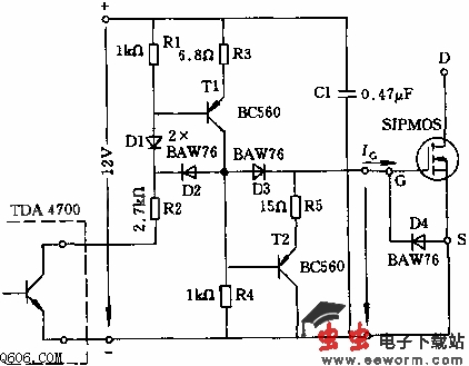 该电路输入端接集成电路TDA4700,当其中输出晶体管导通时,则T1的基极上就加有由R1、R2决定的电压。二极管D1、D2用于防止T1过饱和。若TDA4700的输出晶体管截止,则T1截止,T2由R4控制,此时SIPMOS晶体管输入电容(跨接在R5与T2串联电路两端)作为限流电阻。由于采用了推挽控制方式,故电路电流的消耗很小。