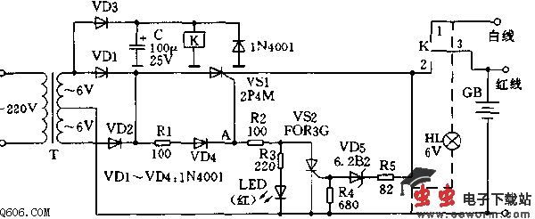 “千里眼”充电器电路如图所示。其中单向晶闸管VS1为电瓶GB的充电电流管,VS2为电瓶充电时作切断充电电流之用。当接通电源充电时,继电器K动作,触点3与触点2接通,VS1的触发端从R1和VD4取得触发电压而导通,整流电流通过VS1向电瓶GB充电。当电瓶GB充电到设定的电压时(例如7.2V),VS2导通,导致VS1触发端A点电位大大低于VS2的阴极电位,VS1截止,电瓶GB停止充电。发光管LED作充电显示用,电瓶充电停止、VS2导通时,LED熄灭。6V指示灯HL作~220V停电指示用。