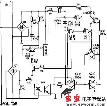 本电话防盗报警器除了具有一般电话防盗的功能外,还具有并线盗用报警、断线盗用报警及无需加任何外部电源等功能。该电路防盗器主要由两片CMOS集成电路组成,结构简单。它主要由极性转换电路(Q1、Q2)、电压检测电路(R2、VD1、VD2)、逻辑判断电路(A1)、记忆显示电路(A2、V1)和报警驱动电路(V2、V3蜂鸣器)等几部分组成。