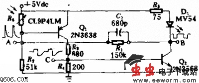 只有当光电池被其伴随的发光二极管照射时,本电路才产生约5kHz,5V的脉冲。重复频率随照度而变化。因此光线的中断或衰减会产生便于检测的频率变化,这种变化可以用作控制信号。本电路可应用于失效-安全中断监视器和照明换能器。若光束被完全中断,或者很强的光线照射到光电池上,则电路停止振荡。