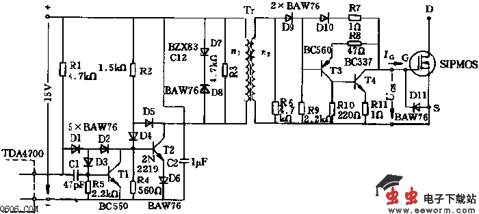 该电路的特点是适于多个SIPMOS晶体管同时控制,此时变压器次级绕组可以有多个,每个次级绕组都要有自己的放电回路。