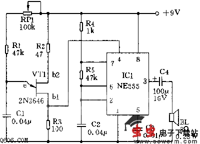 本电路十分简单,可以用普通元件构成,它包括两只振荡器,一只是采用单结晶体管VT1(2N2646)的可变低频振荡器,VT1不用谐振线圈也可产生振荡,电路如图所示。