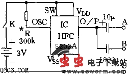 电路如图所示。本电路是一块HFC5203A“请随手关门”的语音芯片制作而成的。由于语音信号中含有十分丰富的多次谐波成分,所以该信号发生器不但能作为低频放大电路的检查,还能作为中频信号电路的检查。图中A端为低频信号输出端;B端为中频信号输出端;C端为公共接地端。只要电路焊接无误,无需调试,即能使用。
