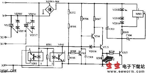 该图为电话机防线路盗打并且具有同线保密功能的电路。它主要由非法并机检测电路、噪音干扰电路、同线保密电路三部分组成。在电话机与外线之间接入本电路,若外线有盗打话机接入时,该电路工作,向线路上发送强烈的噪音,使盗打电话发出的脉冲或双音频拨号总不能被接收,且防盗指示灯亮,主人可顺线路追查盗打者。图中a、b为外线,X1、X1'及X2、X2'为合法用户电话机接入点。