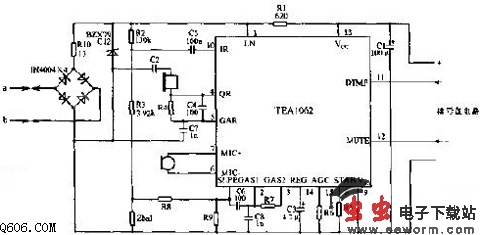 TEA1062是飞利浦公司生产的双极型集成电路,能完成话音的通路,线路接口和拨号盘接口功能,拨号和通话采用电子转换,有低至1.6V直流线路电压,适应多机并联。该图是其在电话中的典型应用。