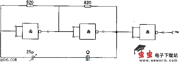 该电路采用两个7400TTL“与非”门,振荡频率可达18MHz。两个820欧电阻必须根据所选取的振荡频率精心调整确定。