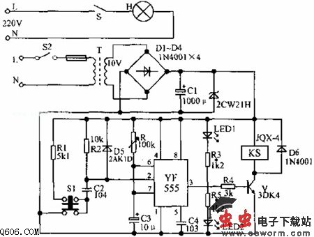 当S1被按下一次后,低电平使单稳被触发,YF555的3脚输出高电平,三极管V导通,继电器通电,其触点闭合,曝光灯H发光,进行曝光。这时,LED1熄灭;LED2点亮,表示曝光正在进行,待时间延时之后,单稳态触发器恢复原始状态,时基电路的3脚又跳变为低电平,一次曝光结束。再按一下S1按钮,上述工作可重复一次。单稳触发器的延时时间由电位器R、电容器C3值的乘积决定。图中电路大约可延时1~120秒。