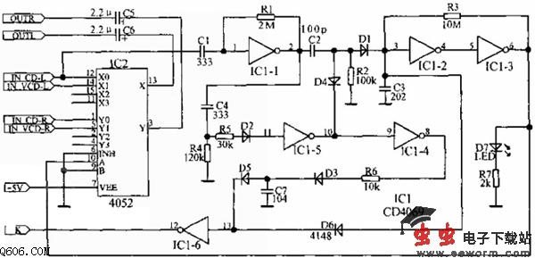 用带DAC的VCD解压板改装的CD机播放质量不高的CD片时,会有刺耳的噪声。本电路可自动转换,其原理是放CD时电子开关不动作,输出接原CD的DAC,放VCD时,用CD机DAC输出的VCD未解压特有的嘶嘶声作检测驱动信号,在极短促的时间内,控制转接并锁定VCD音频输出。当放VCD时,嘶声信号经IC1-1的放大,经C1及D1向C2充电,IC1-2、IC1-3翻转,IC1-3输出变高,IC2接通VCD音频信号输出。C4、R4、IC1-4、IC1-5等组成宽频信号输出,延时翻转,作用是当有声音信号输入时,延时一段时间,信号通过D1,让IC1-2、IC1-3有时间作出判别之后锁住D1的输入信号,以消除在放CD时,夹杂的高频信号使IC1-2、IC1-3误动作。IC1-6的13脚接检测托盘退出信号,利用此高电平信号解除两个触发电路的封锁,恢复成初始检测状态。