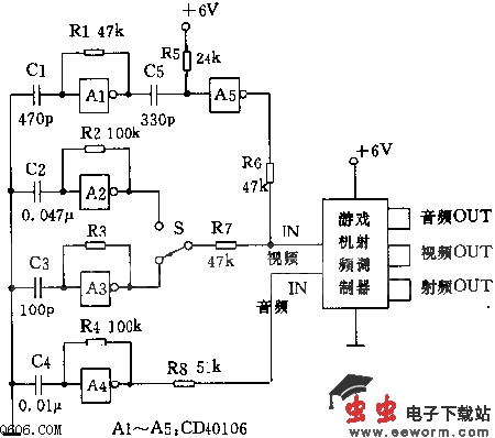 图中:施密特触发器A1~A4分别与RC元件组成行同步、横条、竖条及音频信号振荡器。S用于选择横、竖条信号。A5及微分电路C5、R5将行同步信号整形为5~7us的正向窄脉冲与横、竖条信号一并进入射频调制器。调整R2、R3可改变横、竖条的多少。电源可用6V层叠电池供电。