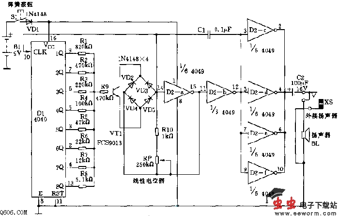 图中的4040型计数器可用国产CMOS的CH4040型12级二进制计数器代替,4049型反相器可用国产CMOS的CH4049(或J330)型六反相缓冲变换器代替,三极管可用国产NPN型小功率管代替,二极管1N4151用国产2CK73D管代替,扬声器BL用2英寸半的8欧高音扬声器。