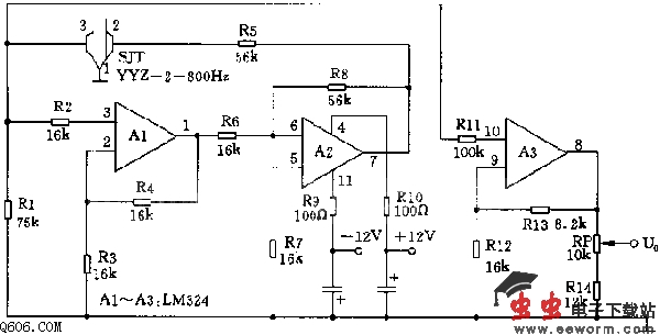 工作原理:电路如图所示。由四运算放大集成块A1~A3(LM324)及SJT(YYZ-2-800HZ)音叉构成的800Hz振荡器。当SJT产生出800Hz振荡信号反馈至A1、A2组成的两级运算放大器,由A2 7脚输出,通过电阻R5、SJT产生正反馈频率信号,放大后的800Hz又经一级A3放大后,其8脚送至电位器RP的可调臂输出(Uo)800Hz正弦波信号。