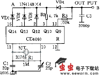 如图是利用一片价廉的CD4060和32768Hz晶体产生高精度每秒输出60个脉冲的时钟源。原理是32768Hz脉冲经CD4060分频后在15、1、2、3脚输出2Hz、4Hz、8Hz、32Hz脉冲,输入由VD1、VD2、VD3、R2组成的或门后,使A点每1/2秒中有1/32秒的低电平,封锁13脚输出的64Hz信号中的2个脉冲,这样就可每秒从13脚输出的64Hz脉冲中除去4个,在B点形成不规则的60Hz时基。C3的作用是消除13脚与A点竞争冒险而产生的极小脉冲。如无C3,B点输出将仍为60Hz。