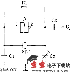 CMOS非门与负反馈偏置电阻R1构成反相放大电路。石英晶体SJT与C1、C2构成帕型正反馈支路。石英晶体在其固有谐振频率的附近,自身呈感性,此电感与电容C1、C2构成谐振回路,形成选频移相反馈网络反馈到放大器输入端,产生振荡。调整电容C2可微调振荡频率。