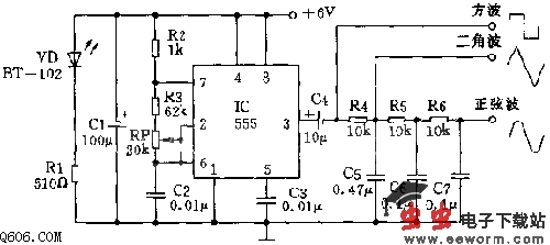 方波信号经R4、C5积分网络后,输出三角波。三角波再经R5、C6积分网络,输出近似的正弦波。