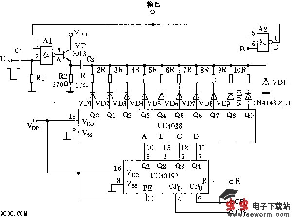 电路中R1、C1构成输入微分电路,当触发脉冲宽度小于单稳输出宽度时可以省去。本电路中,可预置BCD加/减计数器集成电路CC40192的预置输入端DP1~DP4不用时全部接地,进位输出端CO'和错位输出端BO'可悬空。