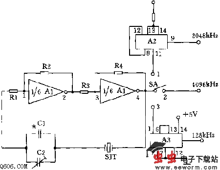 其中,A1和晶体谐振SJT及C1、C2组成4096kHz的方波信号。将开关SA置于1接点,送至A2,经过A2的二分频后,获得2048kHz振荡信号;将开关SA置于3接点送至A3,经A3进行32分频后,得到128kHz振荡信号。调谐电容C1和C2,可使频率精确的调谐在中心频率上。