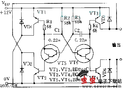 如图所示。该电路以其效率高、驱动能力强而引人注目。它输出对称方波,其幅度随电源电压Vdd而定。VT5、VT6、R2、R3、C1、C2等构成多谐振荡器用来推动四只输出三极管。输出电流Io=B(Vdd-1.4)R1.当R1=R4=68欧,Vdd=12V,VT1~VT4的B=20时,Io高达3A.振荡频率f约为0.7/R2.C1;当取R2=R3=68k欧,C1=C2=0.22uF时,f≈53Hz。该电路用途很多,其中之一是用作逆变器。当取Vdd=14V,R1=R4=33欧,则Io≈6A,转换效率约为40%。在输出端连接一只9.5V、5A的电源变压器的次级绕组,在初级便可获得有效值约为240V的方波电压,可带动一只40W灯泡。该电路静态电流由R1和R4决定,R1=R4=68欧时,静态电流约为0.3A.二极管VD1~VD4用来防止带感性负载时可能击穿输出管。