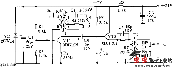 450/800Hz振荡电路是一只变压器偶合振荡器。电路如图所示。该频率的变换是通过改变振荡槽路变量器T1的抽头取得不同电感量来实现。将信号控制开关S扳向“1”挡,振荡回路C4与T1的1-2端并接,频率为800Hz,经VT2射极输出至RP电位器的可调整输出。通过调节电位器RP可改变800Hz输出大小,可调范围0正负1.7/17dB。振荡回路中的电阻R4供调节800Hz振荡幅度。