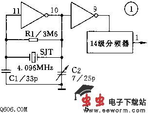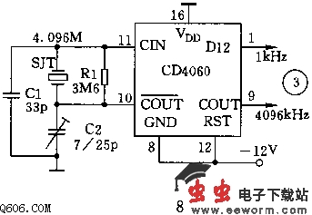 通电后,调整微调电容器C2,使CD4060的第9脚输出频率为4096kHz,然后用蜡封固C2,即可开始使用。同理,也可以利用CD4060的其它输出端来获得多个离散频率点,以满足不同的需要。如图3所示。