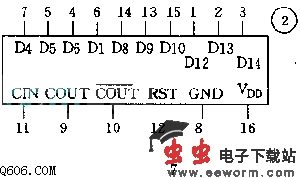 电路如图1所示。CD4060与其10、11脚的外接电阻R1、晶体SJT及电容C1和C2构成振荡电路。调整C2可将振荡频率调整到准确值。其中R1是反馈电阻,以确定门电路的工作点,使本来工作在开关状态的非门工作于电压传输特性的过渡区。CD4060输出的振荡信号经过一级放大后,送到固定分频器部分。本装置是从CD4060的第1脚(即D12端)输出信号的,其分频比为2’12=4096,即输出频率为4096kHz/4096=1kHz。CD4060的管脚功能如图2所示。