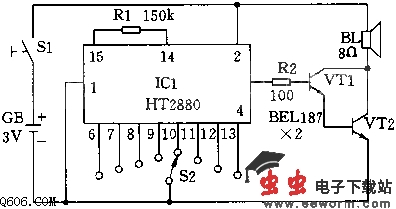 如图所示,八种声音可由转动指旋开关S2加上按钮开关来分别放音。HT2880是一种CMOS大规模集成电路的ROM芯片。
