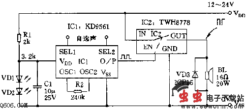 因TWH8778控制极需要有效高电平》1.6V才可将“开关”打开,为使KD9561输出高电平即大于1.6V,本文用两只发光二极管VD1、VD2组成简易的3.2V稳压电源给它供电,此VD1、VD2同时兼工作指示。扬声器BL用16欧、2W的,也可用两只8欧、10W率联代用,因为扬声器为感性负载,故用二极管VD3为续流管。由于发光二极管的特性曲线与稳压二极管非常相似,其正向压降约为1.5~3V,完全可作稳压管。为此,该电路在利用VD1、VD2作稳压管的同时,也兼作电源指示。